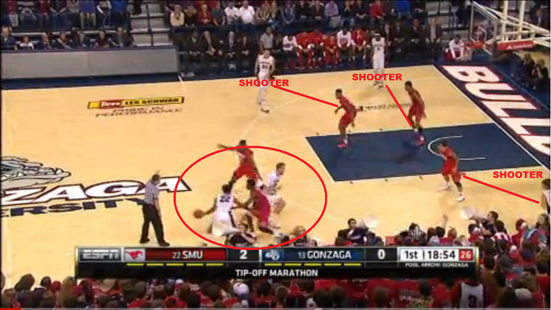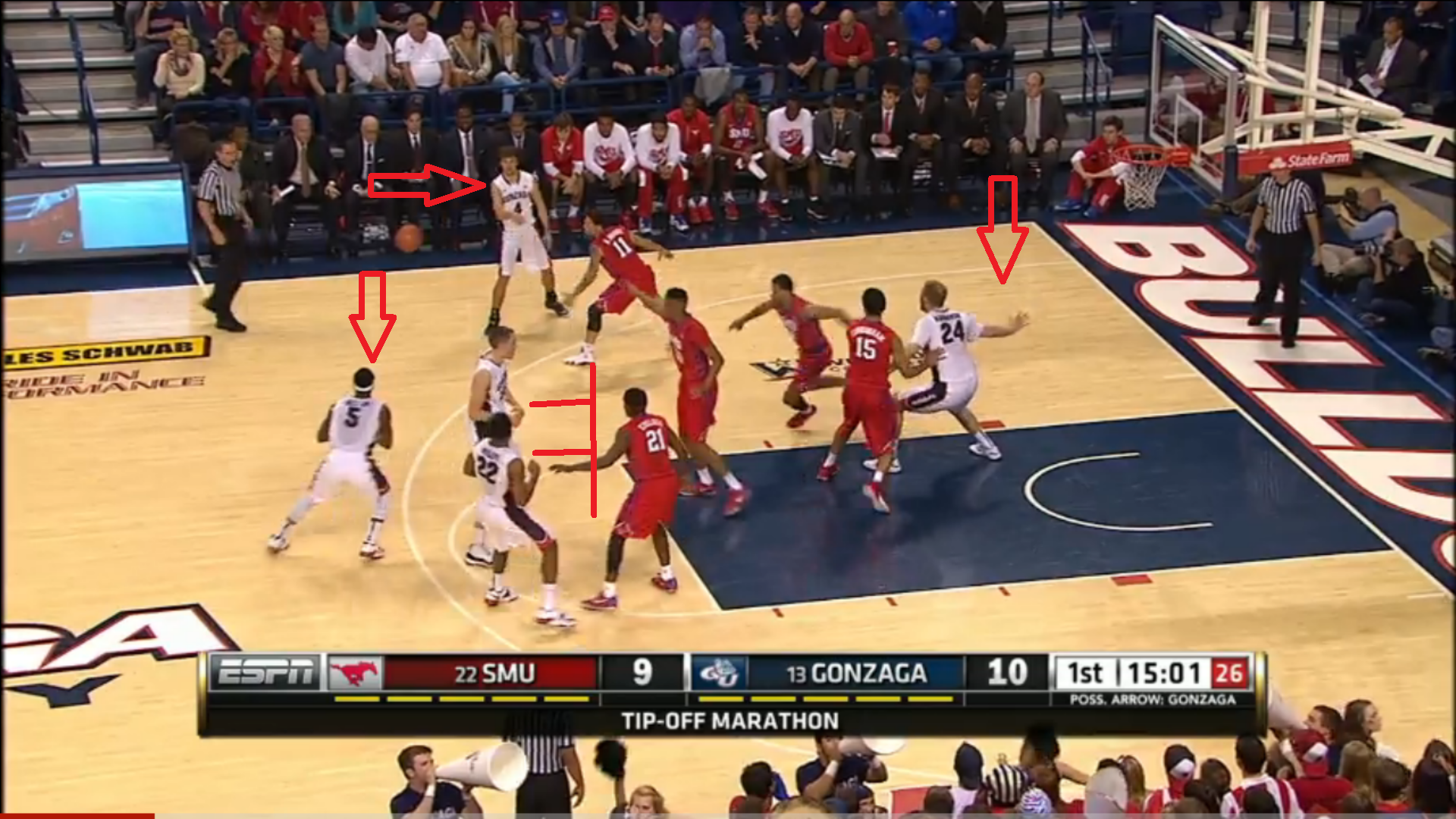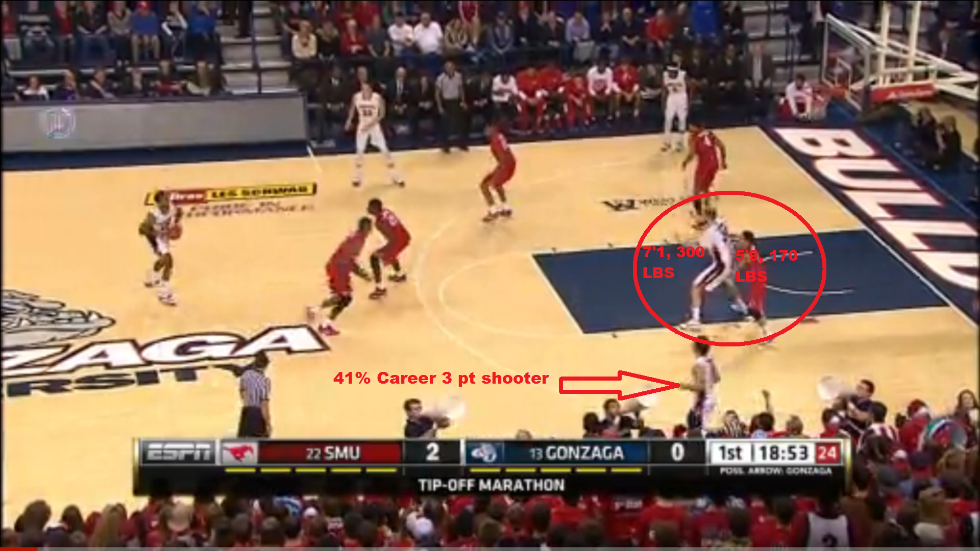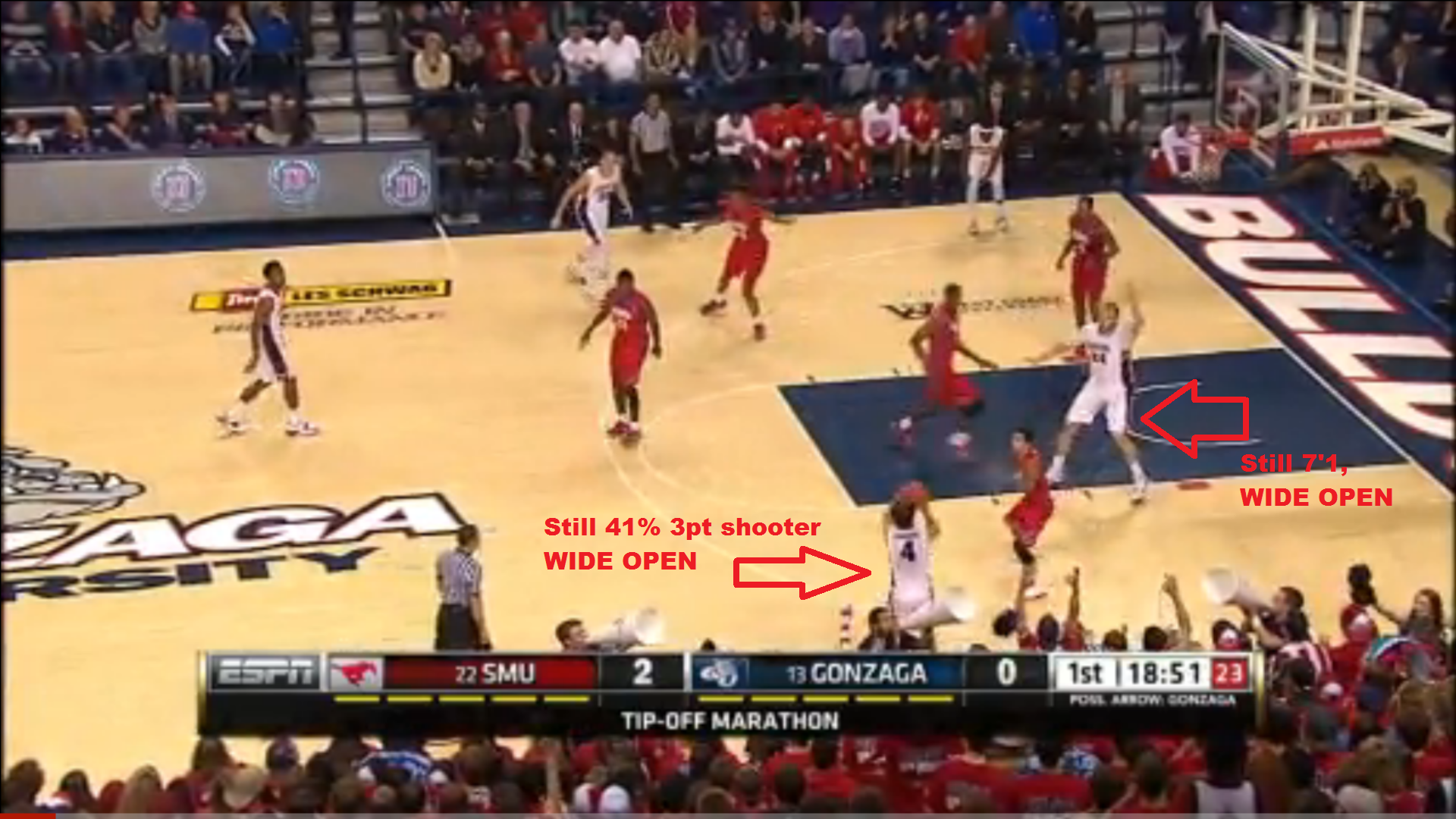 The ball swings to Pangos for a wide open jumper, while Karnowski calls for the ball because he is also wide open. How? SMU needs to be concerned with Wiltjer and Bell, so there’s no help coming from the weak side. Pangos hits one of his 5 threes and the rout begins.