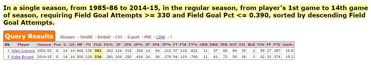 Kobe isn’t helping. Since 1985-86, he’s one of two players to attempt over 330 field goals and shoot less than 39% on those attempts in his first 14 games.