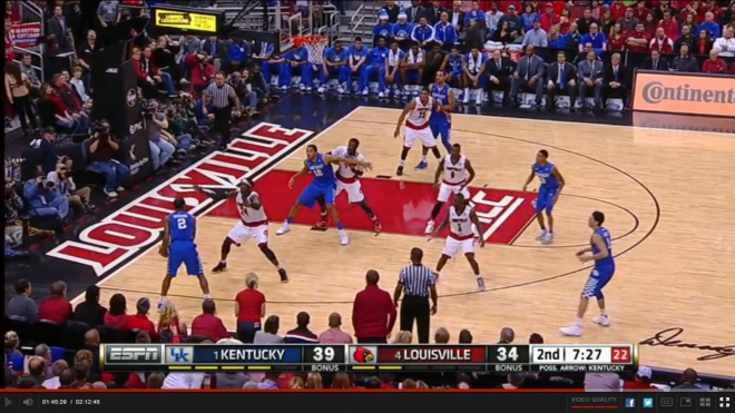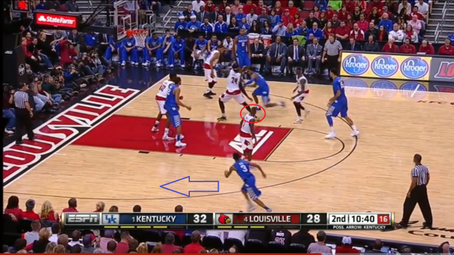 Willie Cauley-Stein comes out to set a screen for Andrew Harrison. Notice all of Louisville’s eyes firmly placed on the dangerous Harrison.