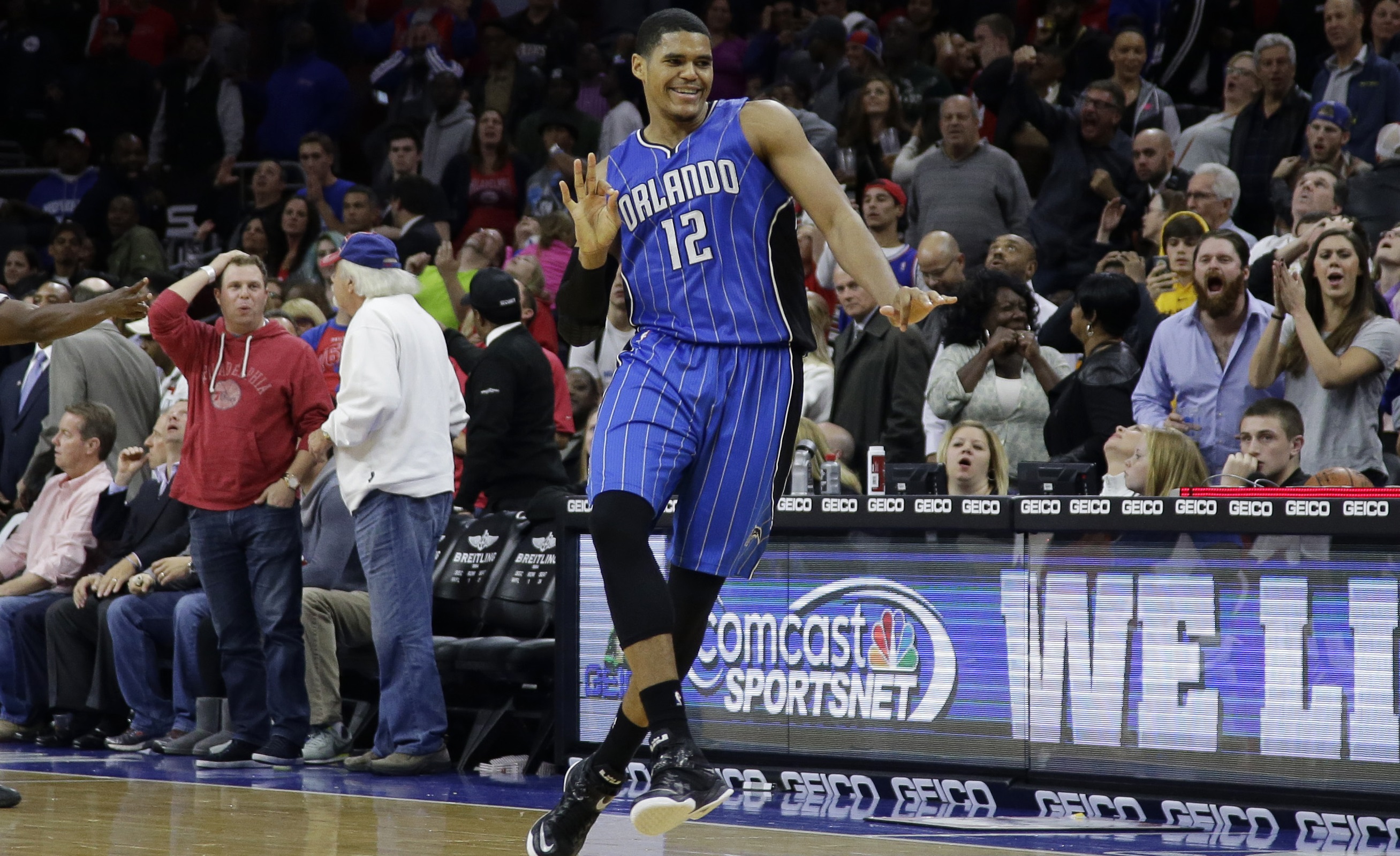 Orlando Magic's Tobias Harris reacts after making the game-winning two-point basket during the final second of an NBA basketball game against the Philadelphia 76ers, Wednesday, Nov. 5, 2014, in Philadelphia. Orlando won 91-89. (AP Photo/Matt Slocum)