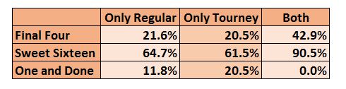 The most significant gaps are the regular season champs being better at reaching the Elite Eight and conference tournament darlings being upset in their opening game.