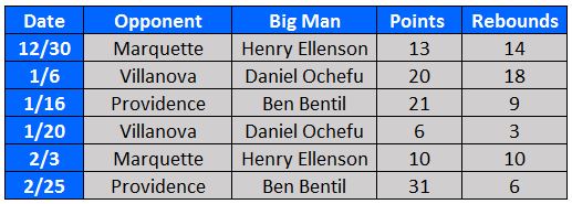 - Seton Hall has played six games against skilled offensive big men this season (this number is low because Seton Hall’s nonconference schedule was terrible. The best non-Big East team they played away from home was a neutral court game with Ole Miss). Here are those six games (the Big East Championship not being included due to Daniel Ochefu’s injury).
