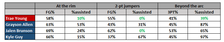 Despite needing to create his own space at the rim, in mid-range, and outside, Young shoots as good or better than some of the best scorers in basketball. At the rim, despite his size and lack of flashy athleticism, Young is still able to find ways to finish.