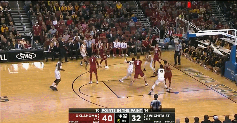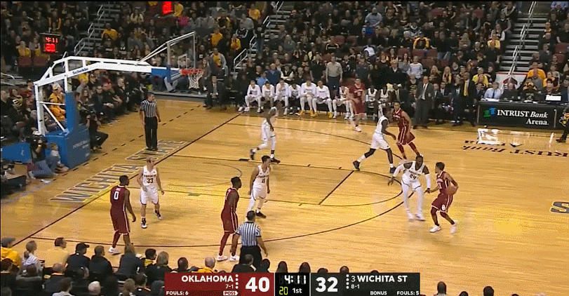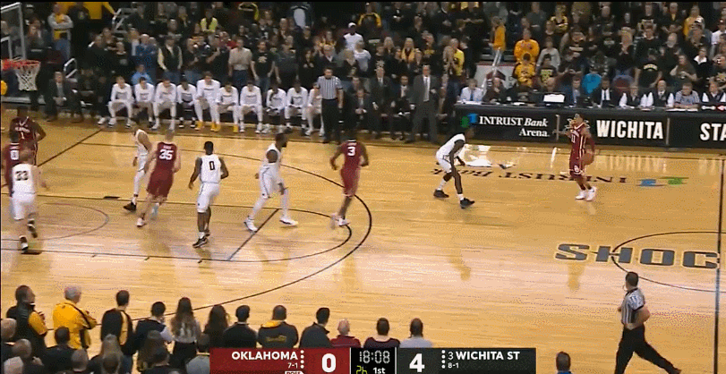 Young leads the nation in more statistical categories than seemingly possible. He’s currently atop the national leaderboards in (deep breath) points per game, assists per game, usage rate, assist rate, points produced, PER, and box plus/minus. To date, the Sooners have 10 wins and only one loss, dropping a game at the PK80 event to a strong Arkansas team. Prepping a scouting report to slow down Trae Young is a tall task that now faces every Big XII coaching staff. His offensive game is so well-rounded and complemented by his teammates that finding his flaws is far more difficult than simply trying to mitigate his biggest strengths. Using tape from the Sooners recent win over Wichita State, we’ll see exactly how Young enforces his will no matter how the defense counters.