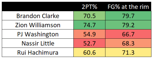 Clarke shot 70.9 percent on 2-point attempts. When defined even further to looks at the rim, he made nearly 80 percent of his attempts. Clarke used to most of his offensive game. Compared to other power forwards in this class, that’s clear: