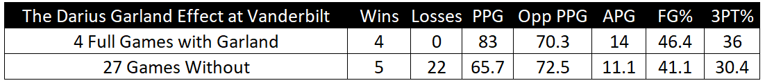 Garland hurt his meniscus in his fifth college game and never returned to the court. With him on the floor, Vanderbilt was a completely different team: