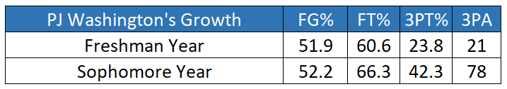 This is essentially the crux of the debate around Washington. If he can be a combo forward, meaning he guards 3s and 4s successfully, pops as often as he rolls off of screens, and makes threes at an impressive clip, I think he has real value. If he can do each of those well, his inside game and his rebounding are special bonuses that will allow him to bully small forwards and his shooting and footwork will help him drive by bigger power forwards.