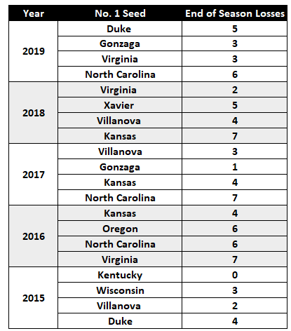 Over the last five seasons, the twenty teams that were awarded top seeds in the NCAA Tournament averaged a total of 4.1 losses for the regular season and conference tournament. Only four of those twenty teams lost more than five games all year.