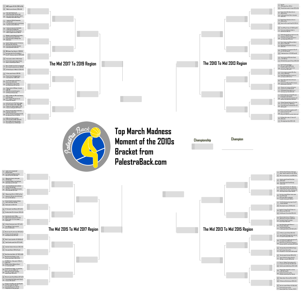 If you see any typos or factual errors, please send them my way via Twitter or by emailing PalestraBack@gmail.com. I threw this thing together in the last few days but may have gone crazy doing so. Also, hit me up if you think a moment got snubbed. Or send me your completed bracket.