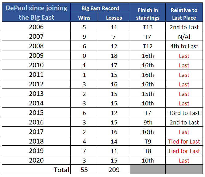 DePaul is currently playing in its 16th season in the Big East. In the prior 15 seasons, DePaul has achieved a winning record in conference play just once, back in 2007. Over those fifteen years, DePaul finished outside the bottom three teams in the conference just twice, but hasn’t done so since 2007. For twelve straight years, DePaul has been one of the three worst teams in the Big East. DePaul has finished last or tied for last place in *ten* of its fifteen seasons in the Big East, including a six season stretch from 2009 to 2014 when the Blue Demons finished in last place, by themselves, all six years.