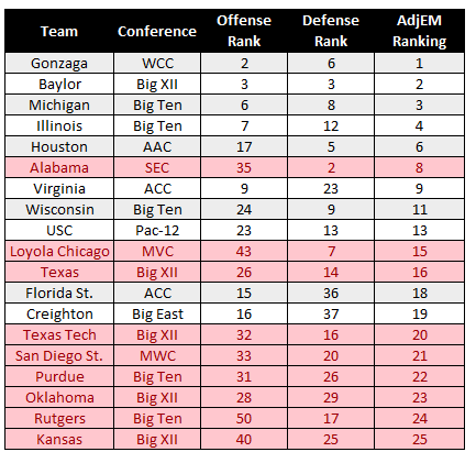 Now let’s execute one final cut. Excluding the outlier Syracuse and UConn teams, every champion entered the tournament in the top six of Adjusted efficiency margin. That would leave us with just five teams left.