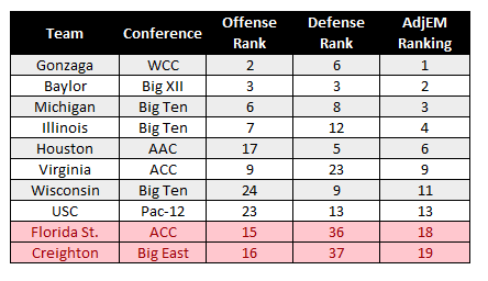 Zeroing in defensively, all but one recent title team was ranked in the top 31 of defensive efficiency (sure, we’re cherry picking these stats). That nixes Creighton and Florida State’s current teams from our list.