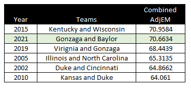 Currently, Gonzaga and Baylor are the 3rd and 4th best teams on that list of 49 teams. Their combined Adjusted efficiency margin would be the second highest of any two teams to enter the NCAA Tournament in the season season, trailing only 2015’s Kentucky and Wisconsin teams who met in the Final Four.