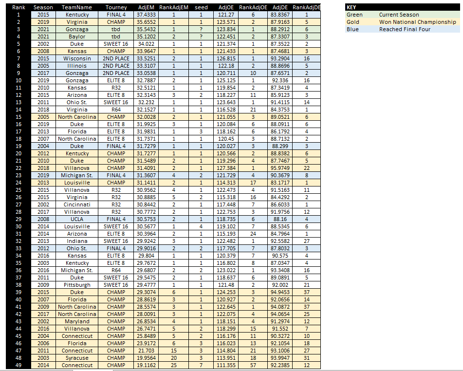To really understand how good these two teams are shaping up to be, I pulled the data from every team that entered the last 18 NCAA Tournaments with an Adjusted efficiency margin over 29.5, as well as every team in those 18 seasons that would go on to win the National Championship at season’s end. This excludes this year, obviously, and last year, because there was no NCAA Tournament. Here’s our findings from that data deep dive: