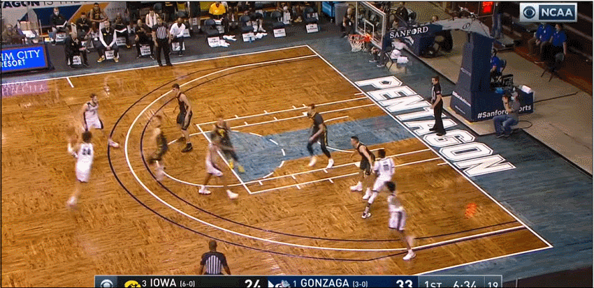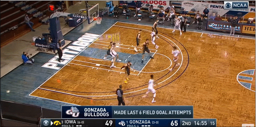 At times, Iowa has responded by sitting Garza as the center of a 2-3 zone. That’s been no better, with teams using the high post and the short corner to put Garza in the hot seat. This last GIF may not be totally Garza’s fault, as Gonzaga has him on an island in a 2-on-1 situation, yet these are the kinds of plays Iowa is going to face when they need to use a zone to cover Garza’s flaws.